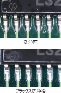フラックス洗浄とは、電子部品の実装におけるはんだ付けと同時に発生するフラックス残渣を除去する工程のことです。 |